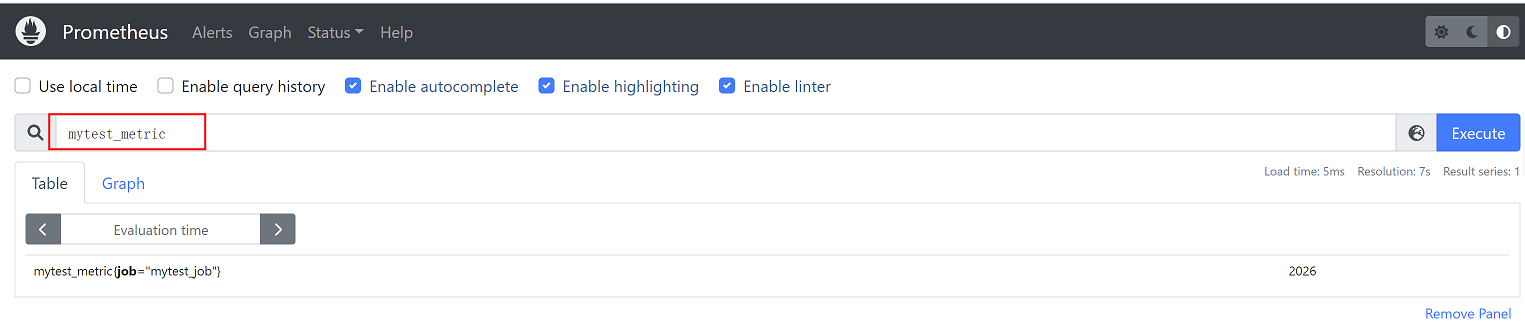在prometheus控制台搜索mytest_metric,查看是否已经从pushgateway抓取到该数据