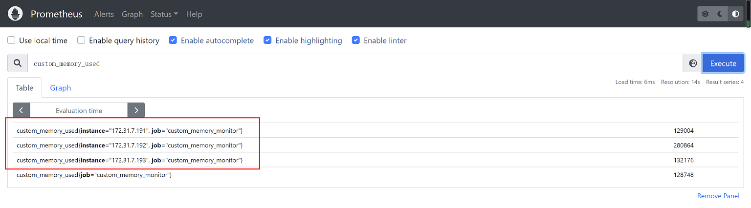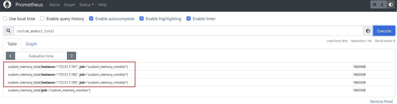 2、在prometheus控制台查看custom_memory_total数据和custom_memory_used数据