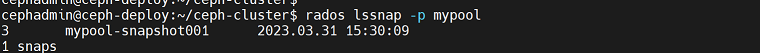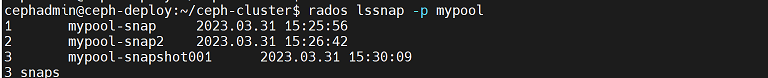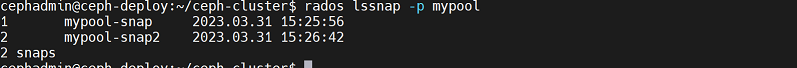 cephadmin@ceph-deploy:~/ceph-cluster$ rados lssnap -p mypool