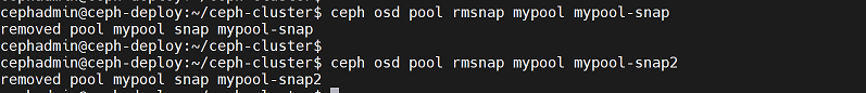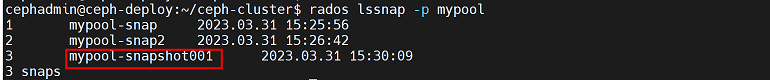 cephadmin@ceph-deploy:~/ceph-cluster$ ceph osd pool mksnap mypool mypool-snapshot001