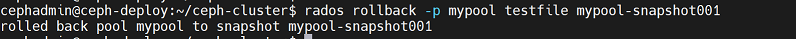 cephadmin@ceph-deploy:~/ceph-cluster$ rados rollback -p mypool testfile mypool-snapshot001