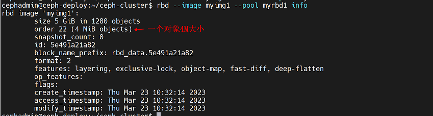 cephadmin@ceph-deploy:~/ceph-cluster$ rbd --image myimg1 --pool myrbd1 info