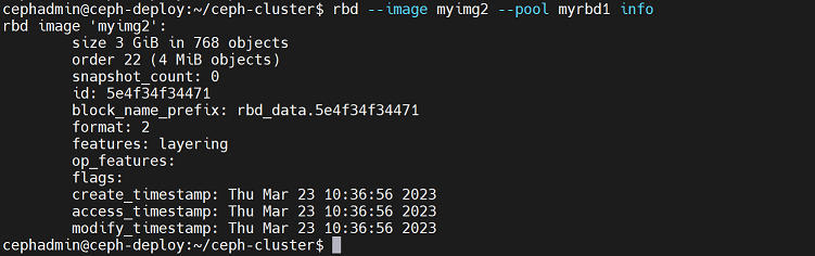cephadmin@ceph-deploy:~/ceph-cluster$ rbd --image myimg2 --pool myrbd1 info