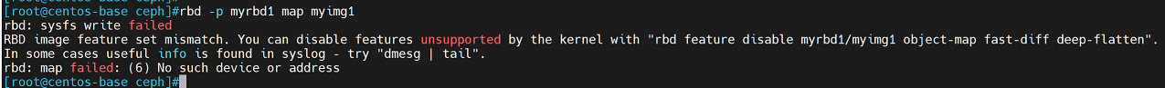 [root@centos-base ~]# rbd feature disable myrbd1/myimg1 object-map fast-diff deep-flatten