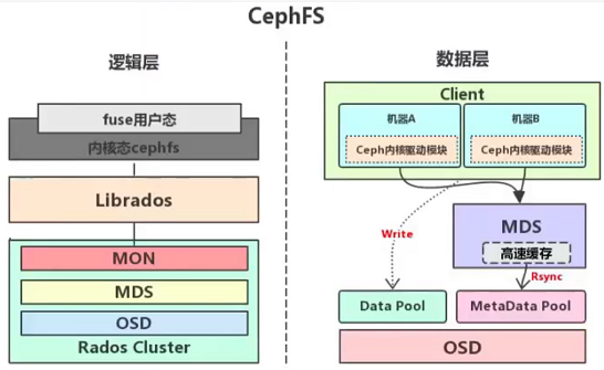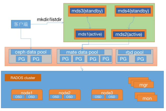 Ceph FS 需要运行 Meta Data Services(MDS)服务,其守护进程为 ceph-mds,ceph-mds进程管理在cephFS 上存储的文件相关的元数据,并协调对 ceph 存储集群的访问。