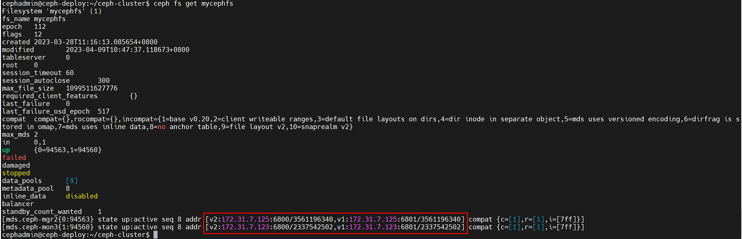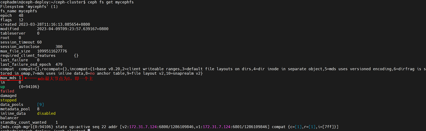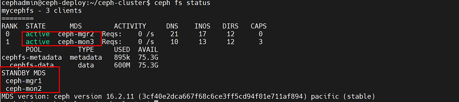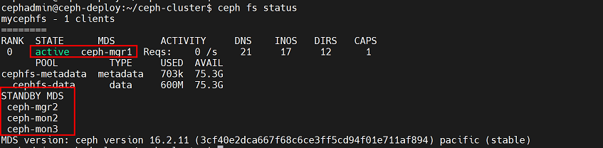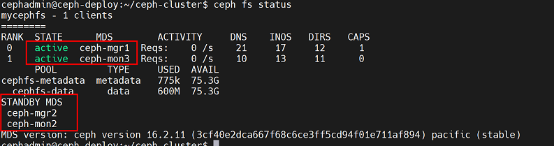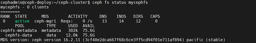 cephadmin@ceph-deploy:~/ceph-cluster$ ceph fs status mycephfs