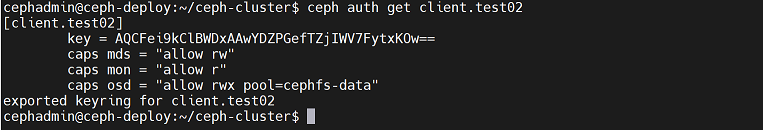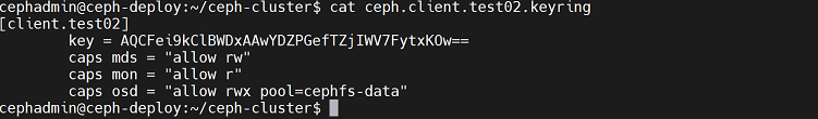 cephadmin@ceph-deploy:~/ceph-cluster$ ceph auth add client.test02 mon 'allow r' mds 'allow rw' osd 'allow rwx pool=cephfs-data'            #给普通用户授权,mon读权限,mds读写权限(需要想mds写入元数据),osd读写执行权限