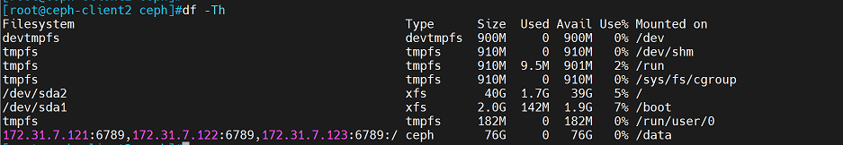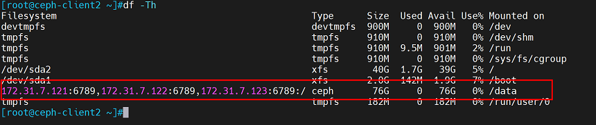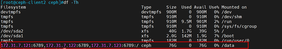 [root@ceph-client2 ~]# mount -t ceph 172.31.7.121:6789,172.31.7.122:6789,172.31.7.123:6789:/ /data -o name=test02,secret=AQCFei9kClBWDxAAwYDZPGefTZjIWV7FytxKOw==