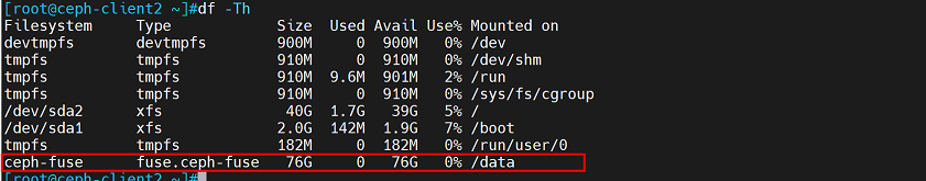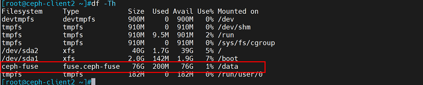 [root@ceph-client2 ~]# mount -t ceph 172.31.7.121:6789,172.31.7.122:6789,172.31.7.123:6789:/ /data -o name=test02,secretfile=/etc/ceph/test02.key