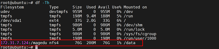 mount -t nfs 172.31.7.124:/magedu /data #这里的/magedu是指配置文件中指定的nfs挂载路径