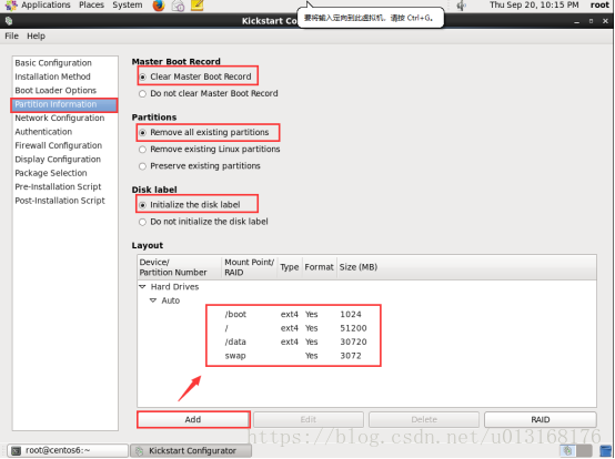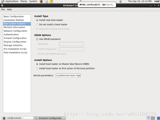 bootloader --location=mbr --driveorder=sda --append="crashkernel=auto rhgb quiet"     启动时第一阶段的mbr分区表